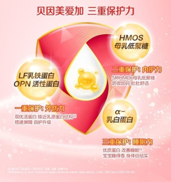 贝因美专注中国母乳研究30余年,始终遵循“母乳是婴儿配方奶粉的黄金标准”, 不断认识、解密母乳。贝因美爱加除乳铁蛋白、OPN活性蛋白外,也应用其余仿生营养成分,如α-乳白蛋白、5种HMO母乳低聚糖等营养素,实现三重保护的全面免疫营养配方。加上高含量DHA-ARA、牛磺酸、叶黄素等多种营养成分,充分保障婴幼儿抵抗力与脑力营养。贝因美爱加经过科学严谨的临床效果评价,运用三大专利技术,打造仿生配方,用心延续妈妈的爱。